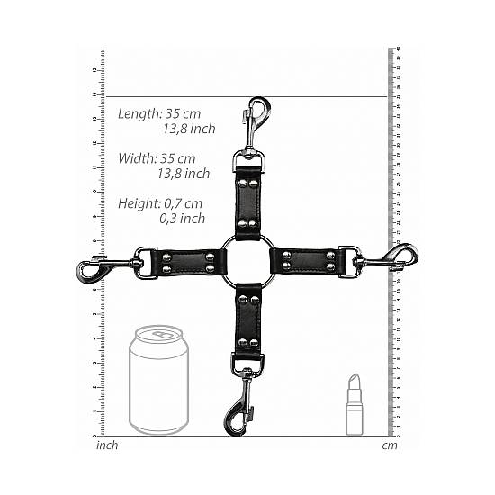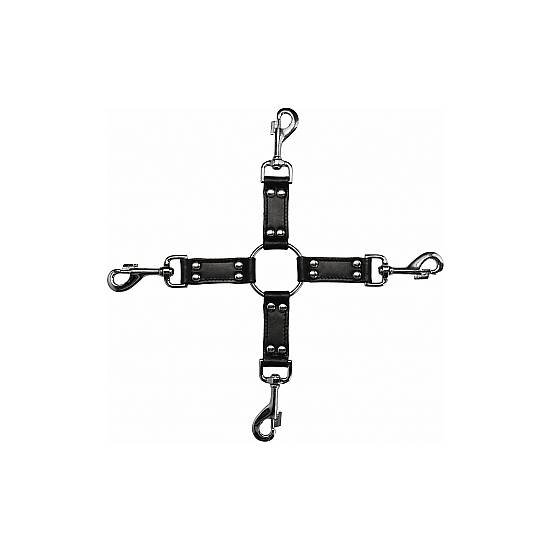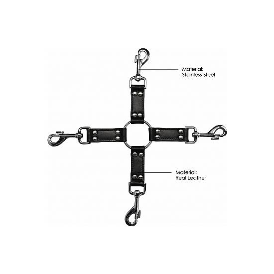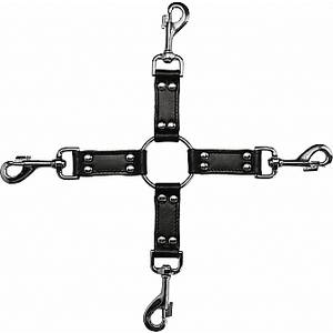 Comienza con un fuerte aro metálico mediano, 4 tiras resistentes de cuero, cada una con un clip de fácil apertura, es sencillo anexarlas a aros en forma de D o de O. Ata los brazos y las piernas de tu súbdito detrás de su espalda, o por el frente, ¡para que tengas su control y sumisión total!