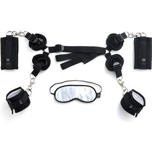 Kit de sujeción de cama con venda para los ojos para un juego de bondage seguro.